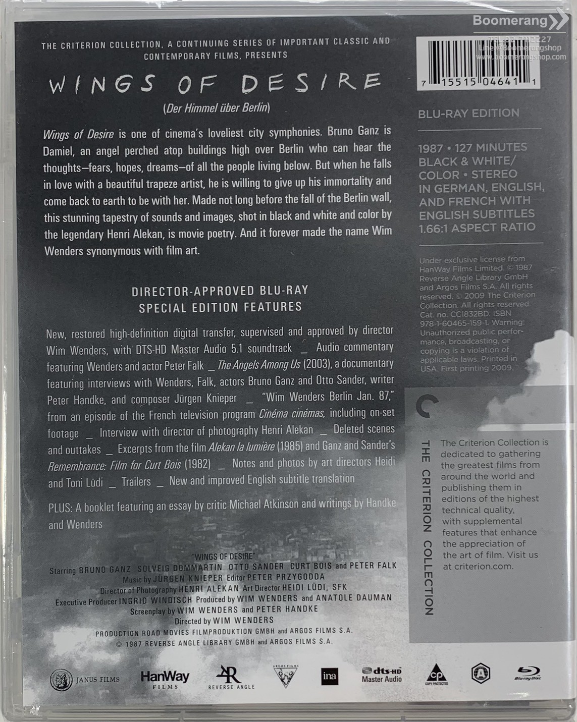 DIRECTOR-APPROVED SPECIAL EDITION FEATURES• New; restored high-definition digital transfer; supervised and approved by director Wim Wenders with DTS-HD Master Audio 5.1 soundtrack • Audio commentary featuring Wenders and actor Peter Falk • The Angels Among Us (2003); a documentary featuring interviews with Wenders; Falk; actors Bruno Ganz and Otto Sander; writer Peter Handke; and composer J?rgen Knieper • Excerpt from: Wim Wenders Berlin Jan. 87; an episode of the French television program Cin?ma cin?mas; including on-set footage • Interview with director of photography Henri Alekan • Deleted scenes and outtakes • Excerpts from the films Alekan la lumi?re (1985) and Remembrance: Film for Curt Bois (about the actor who plays Homer in Wings of Desire) • Notes and photos by production designer Heidi L?di and art director Toni L?di • Trailers • New and improved English subtitle translation • PLUS: A booklet featuring an essay by critic Michael Atkinson and writings by Wenders and Handke
