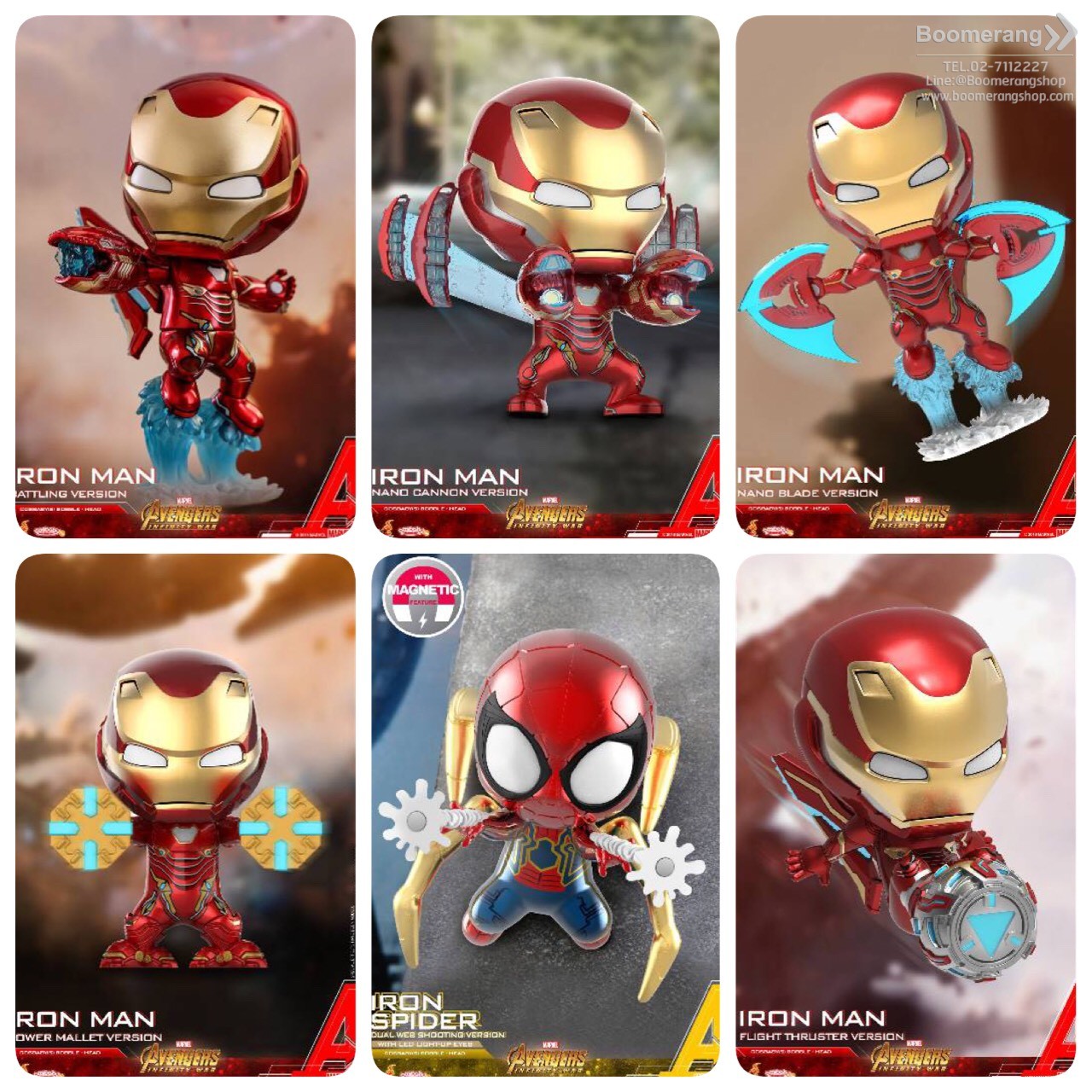 HOT TOYS // COSBABY S Size Bobble-HeadCOSBABYAvengers Infinity WarIRON MAN Collectionสินค้าในชุดประกอบด้วยหุ่นจำลอง 6 รายการ ดังนี้#1 COSB462 IRON MAN Battling Version#2 COSB497 IRON MAN Nano Cannon Version#3 COSB498 IRON MAN Nano Blade Version#4 COSB499 IRON MAN Power Mallet Version#5 COSB500 IRON MAN Flight Thruster Version#6 COSB501 IRON SPIDER Dual Web Shooting Version