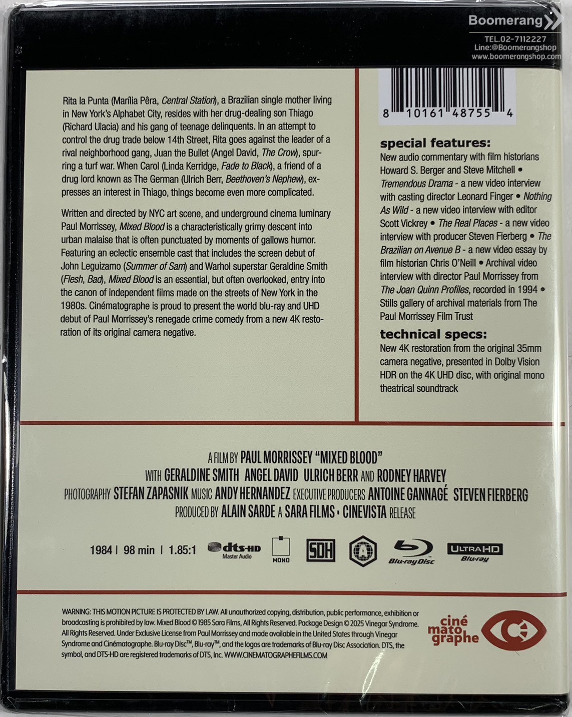 HomeProductProduct Detail Browse CategoryDVDBlu-rayCDVinylGameMerchandiseBooksHardware Newsletter Keep up-to-date with new releases and great offers Click for larger image and over views พบข้อมูลผิด แจ้งที่นี่! สั่งซื้อหรือสอบถามข้อมูลเพิ่มเติมผ่านไลน์แอด คลิกที่นี่ Mixed Blood (USAมีสต็อกUHD) Format: 4K-UHD UPC: 0810161487554 Product Status Shipping & Pickup Checking stock... SRP (Baht) : 2,340.00 Our Price (Baht) : 1,669.00 Click to see shopping cartdetails or checkout. Release Date : 25/11/2025 Distributor : Import Search All Products 4K-UHD Blu-ray DVD CD Vinyl Hardware Game Merchandise Books Title UPC Code ASIN